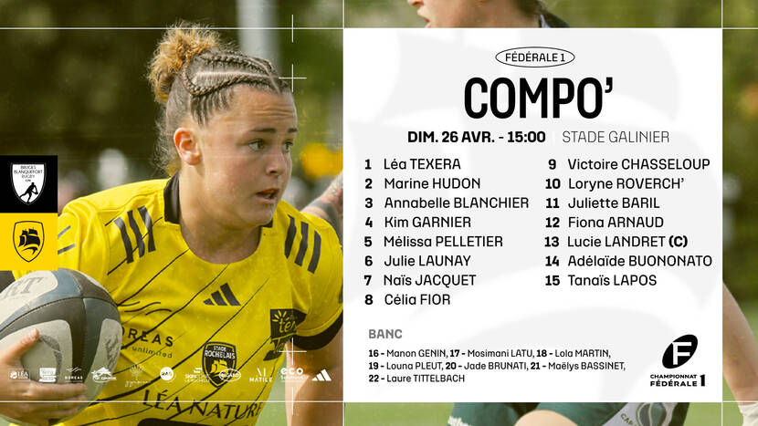 <br><div> <!--<![endif]--> <head profile="http://www.w3.org/1999/xhtml/vocab"> <title rc-meta-value="currentTitle">Fédérale 1, la compo ! | Stade Rochelais</title> <!--[if IE]><![endif]--> <link rel="dns-prefetch" href="https://www.google.com"/> <link rel="preconnect" href="https://www.google.com"/> <link rel="dns-prefetch" href="https://maps.googleapis.com"/> <link rel="preconnect" href="https://maps.googleapis.com"/> <link rel="dns-prefetch" href="https://api.cloudly.space"/> <link rel="preconnect" href="https://api.cloudly.space"/> <meta http-equiv="Content-Type" content="text/html; charset=utf-8"/> <link href="https://www.staderochelais.com/actualites/news/federale-1-la-compo" rel="alternate" hreflang="fr"/> <link rel="shortcut icon" href="https://www.staderochelais.com/sites/stade-rochelais/themes/theme_base/favicon.ico" type="image/vnd.microsoft.icon"/> <meta content="IE=edge" http-equiv="X-UA-Compatible"/> <meta name="viewport" content="width=device-width, initial-scale=1.0"/> <meta rc-meta-tag="metaDescription" name="description" content="Découvrez les 22 joueuses choisies par Bousquet et son staff pour le déplacement à Bruges, demain à 15h00."/> <meta name="generator" content="Raccourci Agency - D7"/> <link rc-link-href="https://www.staderochelais.com/actualites/news/canonicalUrl" rel="canonical" href="https://www.staderochelais.com/actualites/news/federale-1-la-compo"/> <link rc-link-href="https://www.staderochelais.com/actualites/news/canonicalUrl" rel="shortlink" href="https://www.staderochelais.com/node/45732"/> <meta property="og:site_name" content="Stade Rochelais"/> <meta rc-meta-tag="currentType" property="og:type" content="article"/> <meta rc-meta-tag="https://www.staderochelais.com/actualites/news/canonicalUrl" property="og:url" content="https://www.staderochelais.com/actualites/news/federale-1-la-compo"/> <meta rc-meta-tag="currentTitle" property="og:title" content="Fédérale 1, la compo !"/> <meta rc-meta-tag="metaDescription" property="og:description" content="Découvrez les 22 joueuses choisies par Bousquet et son staff pour le déplacement à Bruges, demain à 15h00."/> <meta property="og:updated_time" content="2026-04-25T22:47:27+02:00"/> <meta name="twitter:card" content="summary_large_image"/> <meta rc-meta-tag="https://www.staderochelais.com/actualites/news/canonicalUrl" name="twitter:url" content="https://www.staderochelais.com/actualites/news/federale-1-la-compo"/> <meta rc-meta-tag="currentTitle" name="twitter:title" content="Fédérale 1, la compo !"/> <meta rc-meta-tag="metaDescription" name="twitter:description" content="Découvrez les 22 joueuses choisies par Bousquet et son staff pour le déplacement à Bruges, demain à 15h00."/> <meta property="article:published_time" content="2026-04-25T22:47:09+02:00"/> <meta property="article:modified_time" content="2026-04-25T22:47:27+02:00"/> <!-- Sirdata Code --> <!-- End Sirdata Code --> <meta name="dailymotion-domain-verification" content="dmgea209s5b4ke7m9"/> <!-- Google Tag Manager --> <!-- End Google Tag Manager --> <link type="text/css" rel="stylesheet" href="https://www.staderochelais.com/sites/stade-rochelais/files/advagg_css/css__0nmVrVBXK6DG9f9AfqvanhK5GheNlFApl0f0tgjJLVo__Bw2YM7UabLehZXZZK7-Sc7CGVpYYi9rwitZtdgZ8SMo__mq-ZlakCfvaLypzu7BJVSyIakGOpvfCYbKIYabc-3Fk.css" media="all"/> <!--[if !IE]><!--> <link type="text/css" rel="stylesheet" href="https://www.staderochelais.com/sites/stade-rochelais/files/less/global.css?te0z72" media="all"/> <!--<![endif]--> <!--[if IE]> <link type="text/css" rel="stylesheet" href="https://www.staderochelais.com/sites/stade-rochelais/files/less/global_chunk.css?te0z72" media="all" /> <![endif]--> <link type="text/css" rel="stylesheet" href="https://www.staderochelais.com/sites/stade-rochelais/files/advagg_css/css__ASrqjxZd5JlF9UkCic8IZF-oL4qT8qHygjbe0uhEm2c__j-0QKgMecJIk9yobQBeT3GNaJJ3i-Mnq4QqFCCUUxn8__mq-ZlakCfvaLypzu7BJVSyIakGOpvfCYbKIYabc-3Fk.css" media="all"/> </head> <body class="html not-front not-logged-in no-sidebars page-node page-node- page-node-45732 node-type-news-2016 i18n-fr depth-3 version2 not-raccourci" id="wp_automatic_ReadabilityBody"> <!-- Google Tag Manager (noscript) --> <noscript><iframe src="https://www.googletagmanager.com/ns.html?id=GTM-KJFTNGS%09" height="0" width="0" style="display:none;visibility:hidden"></iframe></noscript> <!-- End Google Tag Manager (noscript) --> <div id="page"> <div id="page-wrapper" class="wrapper"> <!-- Nav --> <header id="masthead" class="masthead theme-pinned-masthead" role="banner"> <!-- Ad banner --> <!-- close masthead-cap-container --> <!-- Nav --> <nav id="masthead-navbar" class="masthead-navbar [ navbar navbar-inverse navbar-static-top ]" role="navigation"> <h2 class="[ sr-only ]">Main site navigation</h2> <!-- /.container--> </nav> </header> <!-- Content-front --> <!-- Content & !front --> <main class="[ container ]"> <div id="block-system-main" class="block block-system"> <!-- // Banner --> <header class="hero-banner row node_news_2016"> </header> <!-- Page body --> <section class="main-section [ _cushion-hero-banner +paint-winter row ]"> <div id="content" class="[ -collection col-xs-12 col-md-8 col-xlg-9 ]"> <!-- Content --> <article class="story-body section container-copy"> <h3 class="story-lead lead type-content">Découvrez les 22 joueuses choisies par Bousquet et son staff pour le déplacement à Bruges, demain à 15h00.</h3> <div class="field-collection"> <div class="field-collection-0 field-collection-item type-slide "> <div id="carousel-diapo-67616" class="field field-name-field-content-page-slider field-type-image field-label-hidden controls-hide carousel slide" data-ride="carousel"> <div class="field-items carousel-inner"> <div class="item even active"> </div> </div> <!-- Controls --> <a target="_blank" class="left carousel-control" href="#carousel-diapo-67616" data-slide="prev"> <span class="glyphicon glyphicon-chevron-left"/> </a> <a target="_blank" class="right carousel-control" href="#carou