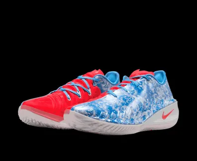 La Nike GT Cut 4 opte pour une version plus « flashy », avec une partie gauche en bleu et blanc et rouge sur la droite sur la chaussure gauche, et inversement sur l’autre chaussure. Le logo historique de la WNBA est présent sur un pendentif rouge et bleu. La semelle, composée d’une couche de Zoom X au niveau intermédiaire, ressort principalement en blanc.