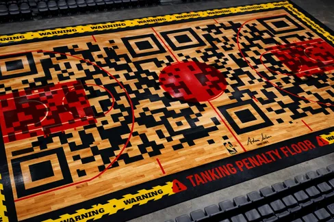 Un parquet impossible à manquer : fond façon QR code géant, marquages rouges agressifs, bandes jaunes « WARNING » tout autour du terrain et une inscription sans ambiguïté le long de la ligne de touche : « TANKING PENALTY FLOOR ». En interne, certains l’appellent déjà le « Floor of Shame », soit le « parquet de la honte ».