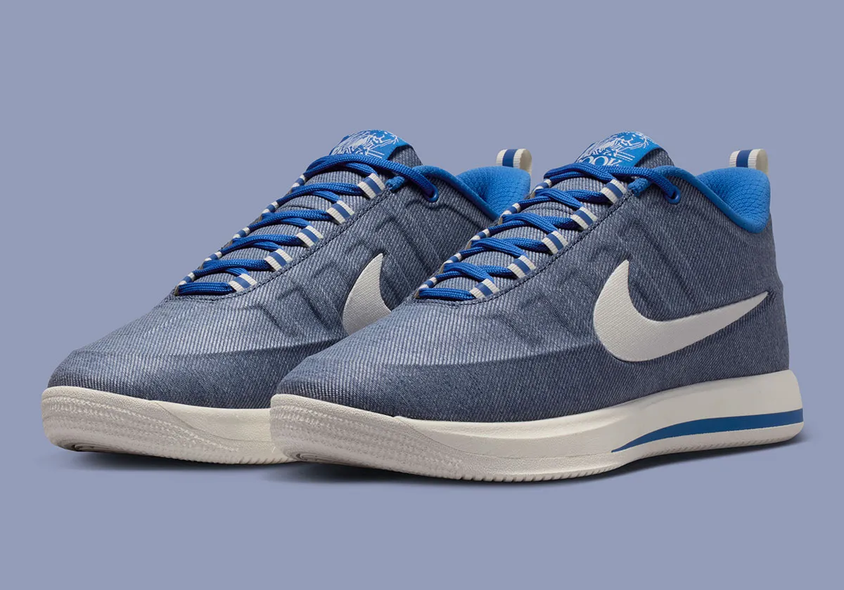 Ce nouveau coloris est habillé d’un motif « Denim » sur la tige, avec un « Swoosh » blanc. L’intérieur du col, les lacets et la languette apparaissent en bleu. L’ensemble repose sur une semelle en blanc et bleu.