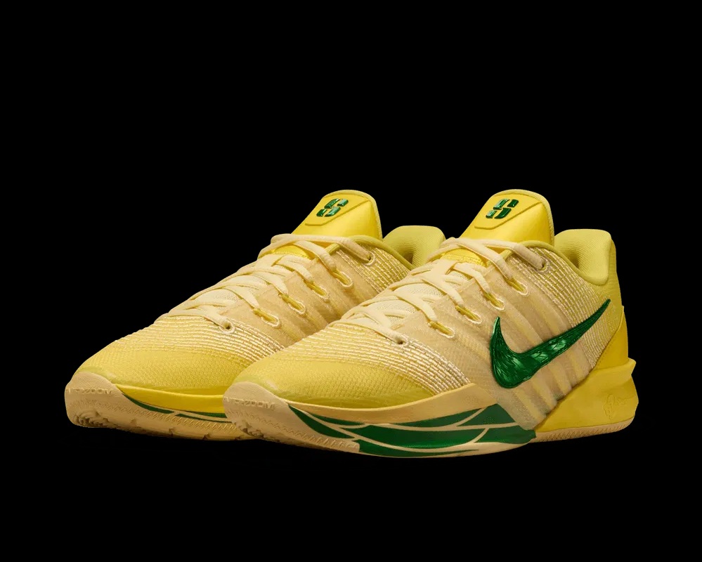 Ce n’est donc pas une surprise de voir la Nike Sabrina 3 dévoiler à son tour un coloris « Oregon », qui vient compléter les Sabrina 1 et 2 du même nom. La paire s’affiche cette année avec une dominante jaune pour habiller la tige et la semelle, et des finitions en vert, pour faire ressortir le « swoosh » latéral, le logo « S » sur la languette ou pour former un motif « ailé » à l’avant de la semelle intermédiaire en Cushlon 3.0.