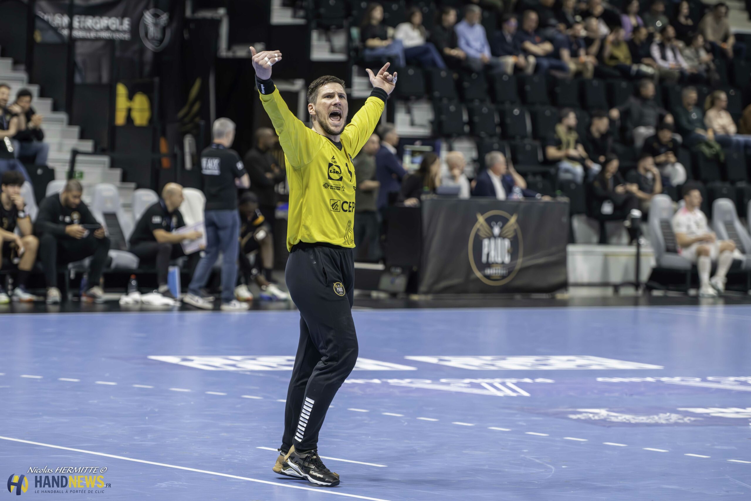 Devant 3 000 spectateurs, Aix-en-Provence retrouvait son écrin pour un duel de milieu de tableau face aux Irréductibles Bretons de Cesson Rennes. C’est le Géorgien Nikoloz Kalandadze qui lance les siens à trois reprises pour réaliser le break d’entrée (3-0, 5’). Cesson Rennes a la tête à l’envers et perd Michal Baran, touché au genou. Les hommes de Sébastien Leriche tombent sur un Joze Baznik en feu, à 42 % dans le premier quart d’heure (12-7, 17’).