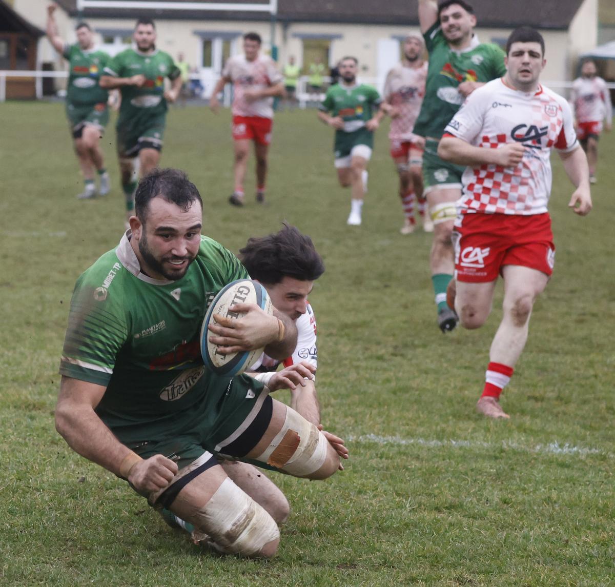 VERGT Cinq essais de Teychenné (20e, 52e), Boyer (48e), Martin (67e), Gendre (75e) ; trois transformations (20e, 49e, 75e) et quatre pénalités (25e, 28e, 43e, 68e) de Bécat.
