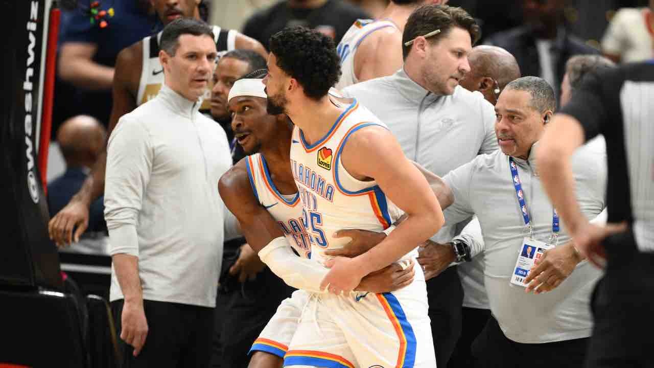L’altercation entre Jaylin Williams et Justin Champagnie a viré au pugilat, après une gifle du Wizard sur Ajay Mitchell, et le leader de l’Ouest a payé un lourd tribut à l’issue de cette mêlée improvisée, avec trois expulsions d’un coup (Jaylin Williams, Ajay Mitchell et Cason Wallace) contre une seule (Justin Champagnie) côté Wizards.